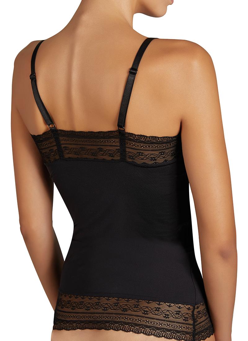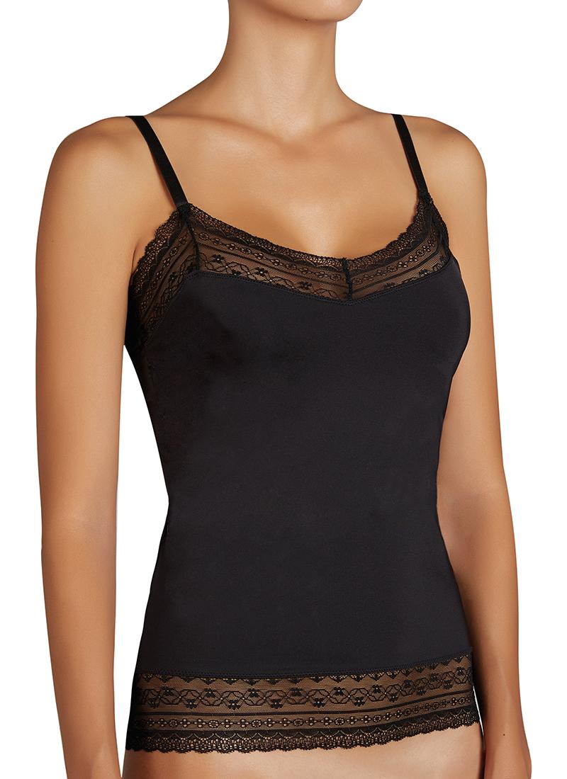 Camiseta negra de tirante fino de encaje. Tejido elástico, suave y de gran adaptabilidad. Diseño decorado con encaje en la zona del escote.